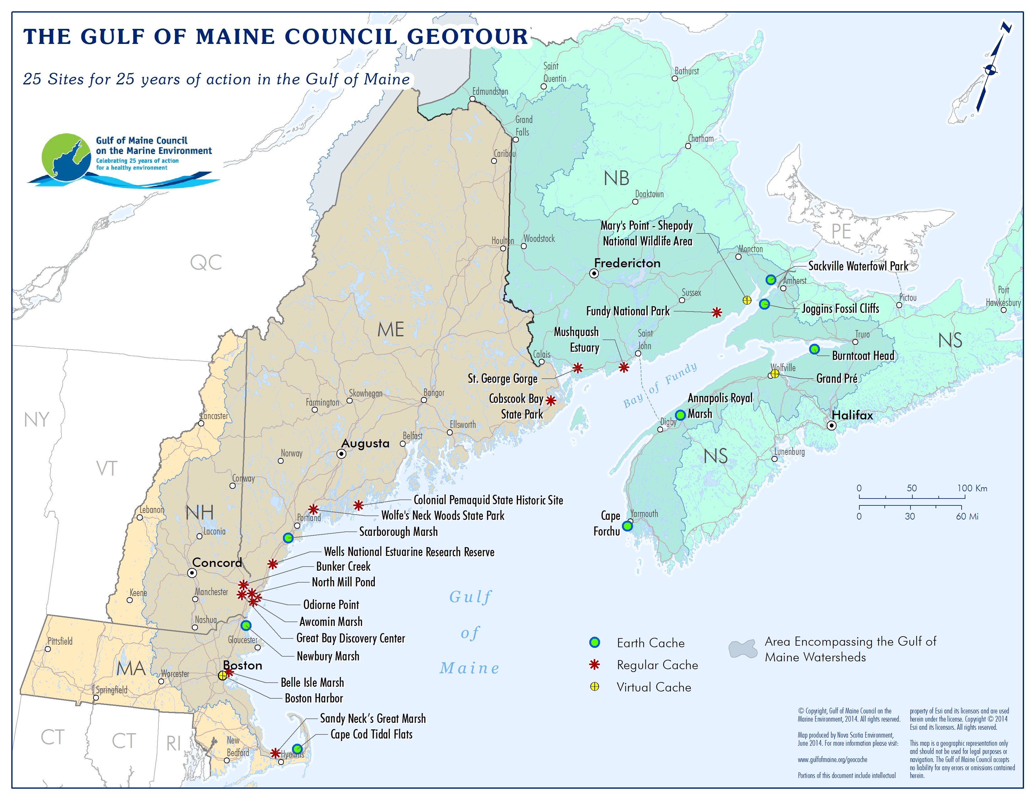 The Gulf of Maine Council on the Marine Environment is celebrating its 25thAnniversary with a geocache tour of the Gulf of Maine Watershed.